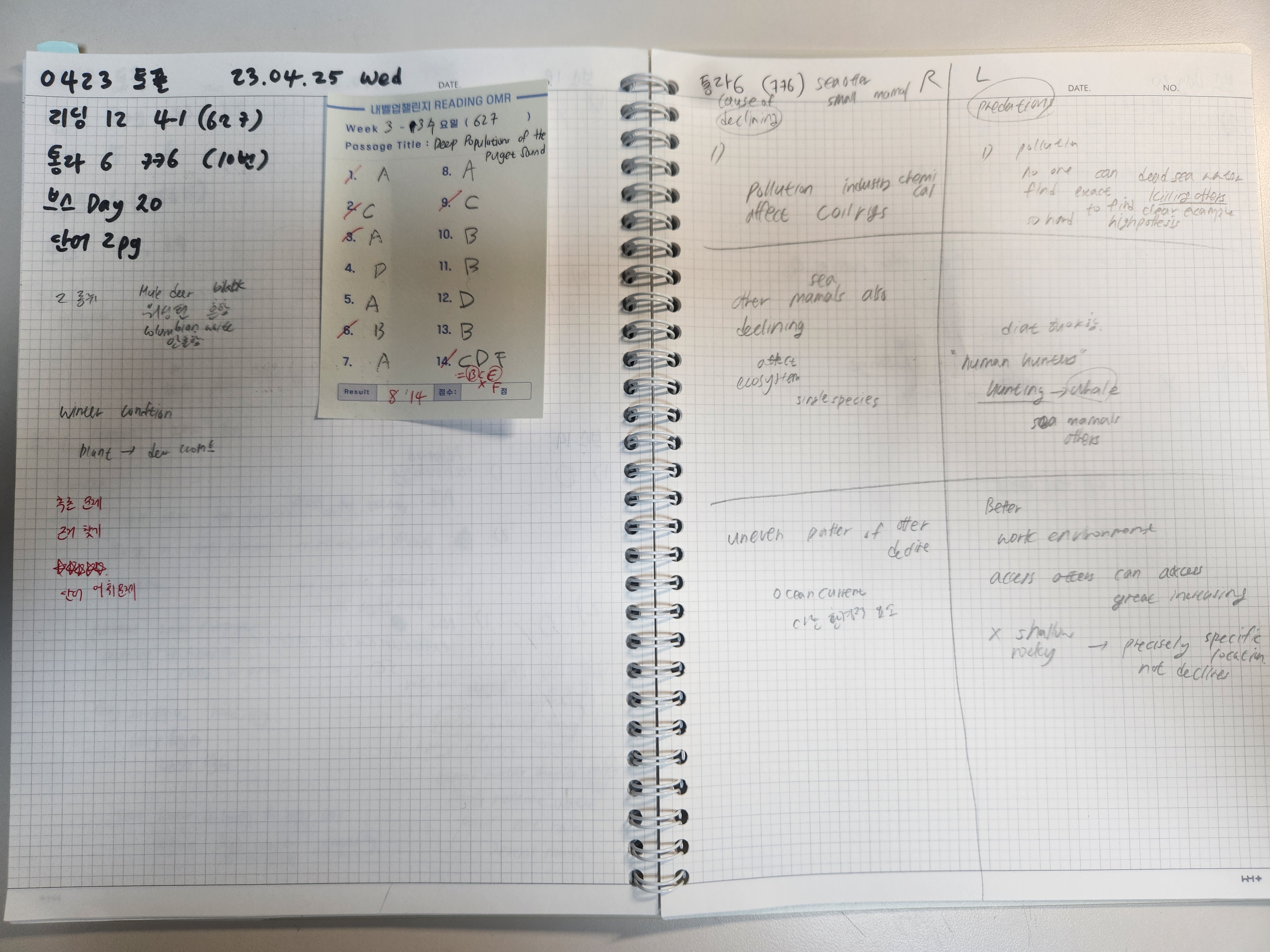 리딩은 다시 풀어보니 다 아는 문제만 틀렸다. 지문은 이해가 되는데 왜 선지만 보면 꼭 2개중에서 헷갈리는지 모르겠다. 근거 찾는 연습을 꼼꼼히 해야겠다.